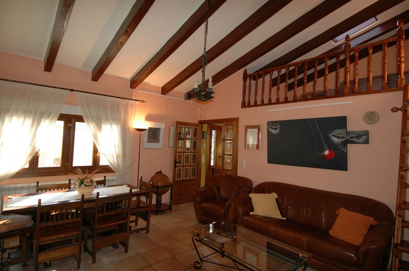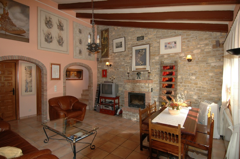 Pokój dzienny w stylu rustykalny udekorowany drewnianymi belkami sufitowymi i kominkiem sprawia, że pomieszczenie jest bardzo wygodne. Cztery sypialnie zaprojektowane są w tym samym stylu, charakteryzujące się oknami dachowymi i wysokimi sufitami. Znajdują się tu dwie eleganckie łazienki i toaleta na wyższym piętrze. Przestronny i przytulny dom wyróżnia się grubymi kamiennymi ścianami, które chronią od latem od upałów, a zimą od chłodu. Duże poddasze z wysokimi sufitami i kominkiem jest pokojem wielorakiego użytku, z możliwością używania go jako studio lub pokój zabaw dla dzieci. Nieruchomość dysponuje też zewnętrzną kuchnia z grillem i dwoma sporymi tarasami.