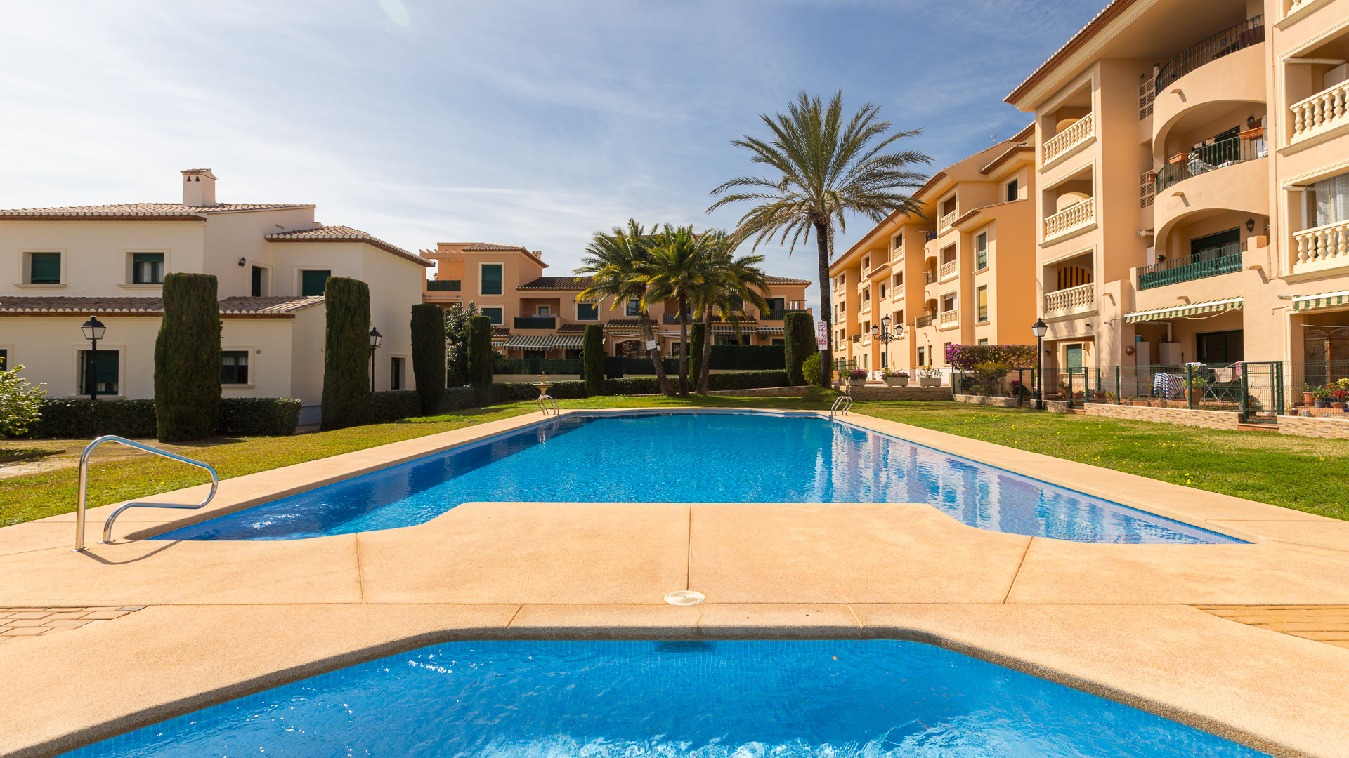 Wśród przestrzeni zewnętrznych nieruchomość oferuje duży prywatny taras o powierzchni 43 m², idealny do korzystania z śródziemnomorskiego klimatu, a także odkryty taras z widokiem na wspólny ogród. Kompleks rezydencyjny posiada kryty i odkryty basen, siłownię, kort do padla oraz tereny zielone, zapewniając bezpieczne i ekskluzywne otoczenie dzięki zamkniętej społeczności.