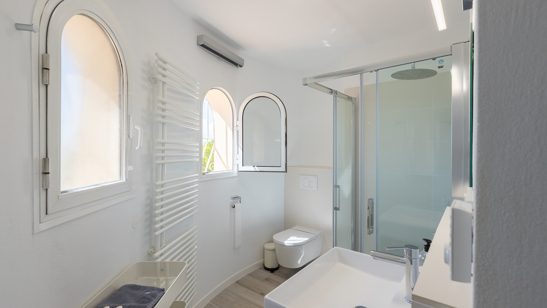 Odnowiony do 2020 roku i składa się z parteru z przestronną jadalnią z kominkiem, salonu z wyjściem na duży taras z przepięknym widokiem na morze i wyspę Portichol, nowoczesnej, w pełni wyposażonej kuchni z pięknym widokiem na morze, dwie sypialnie z garderobami, jedna z nich z garderobą, łazienką i osobną toaletą dla gości.