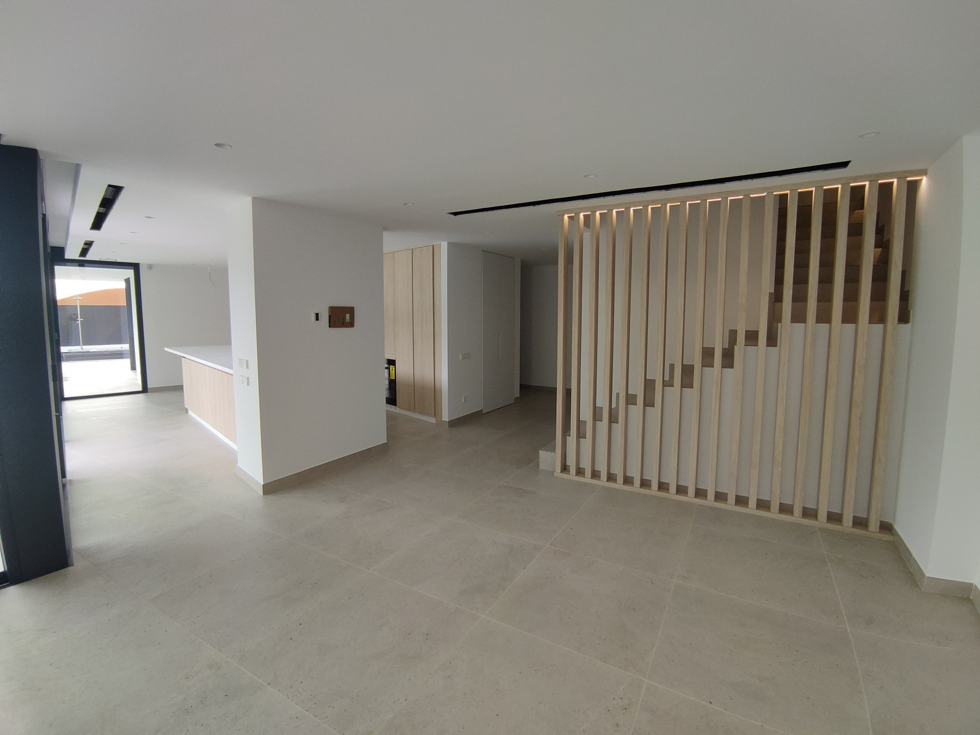 Nieruchomość jest rozłożona na trzech poziomach. Na parterze znajduje się otwarta kuchnia połączona z salonem i jadalnią, z wyjściem na zewnątrz, toaleta dla gości oraz sypialnia z garderobą i łazienką en suite, również z wyjściem na zewnątrz, gdzie znajduje się podgrzewany basen – idealny do relaksu i korzystania ze słońca; odkryty taras z miejscem na grill oraz toaleta.