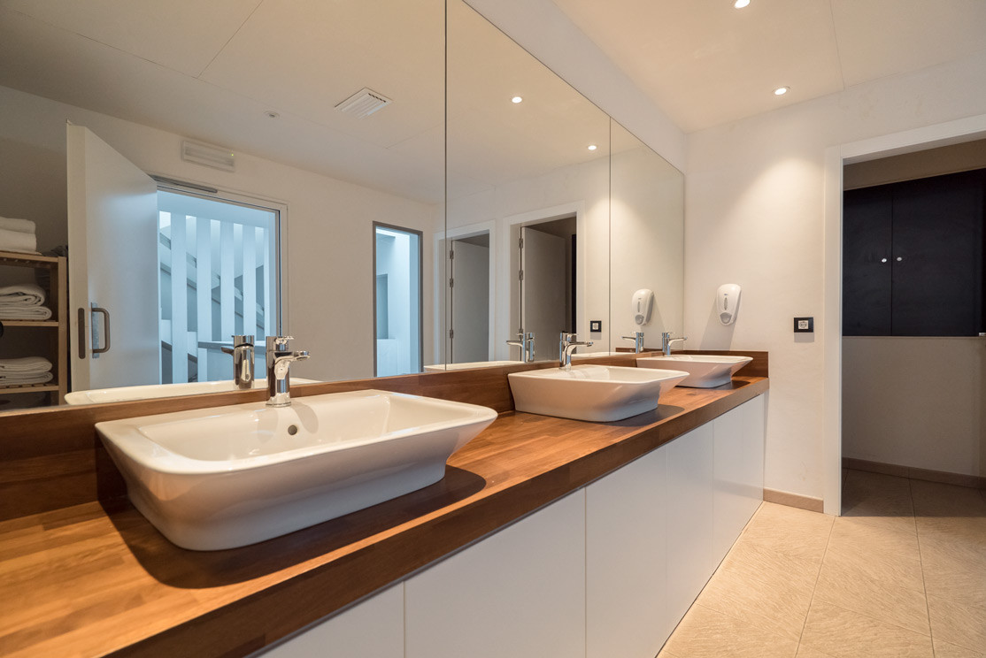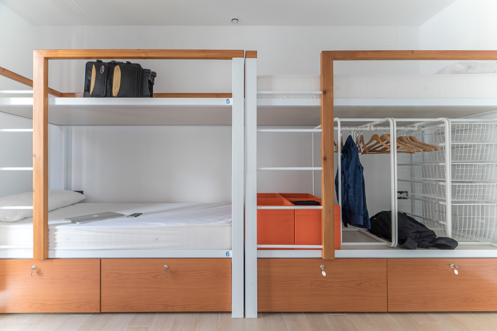 Na pierwszym i drugim piętrze znajdują się strefy sypialne: cztery pokoje mogące pomieścić po cztery osoby oraz kolejne cztery pokoje z miejscami noclegowymi dla ośmiu osób, co zapewnia elastyczność dla większych grup. Każda kondygnacja posiada nowoczesne łazienki wspólne, wyposażone w kilka pryszniców i oddzielne toalety, co ułatwia funkcjonowanie w przestrzeniach dzielonych. Dwa z pokoi posiadają łazienki en suite, co zwiększa prywatność.
