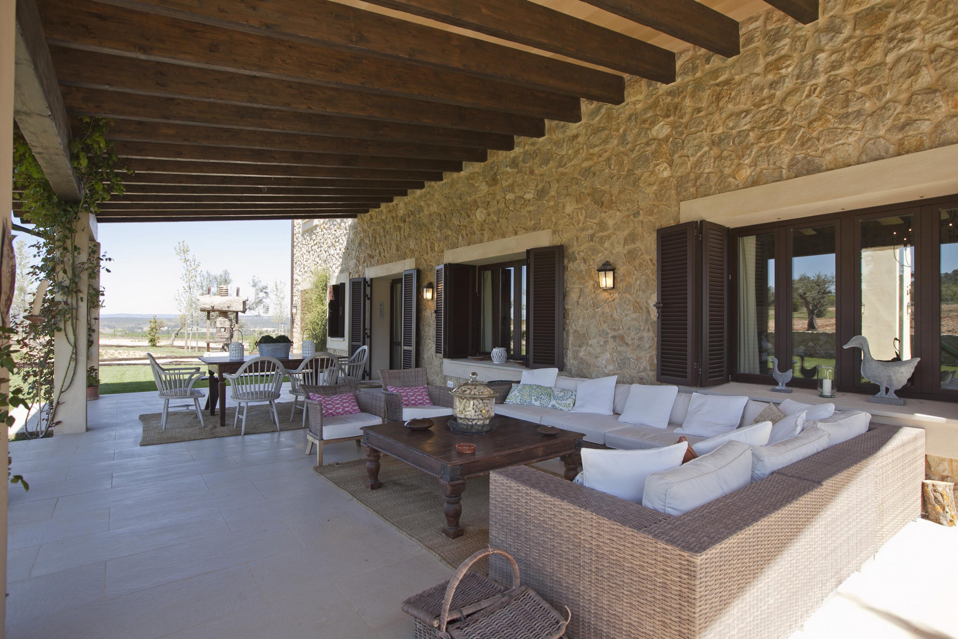 Dom z 750 m2 rozprowadzany na dwóch piętrach, zbudowany jest z materiałów jakościowych, w tym grubych murów kamiennych, które zapewniają naturalną izolację przed zimną zimą i ciepła w lecie. Pomimo łagodnych temperatur w tym regionie, budowa gwarantuje komfort w ciągu roku.